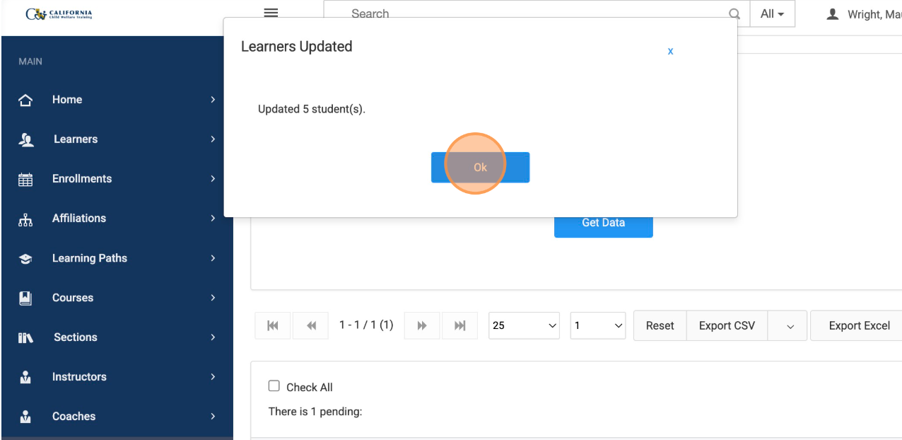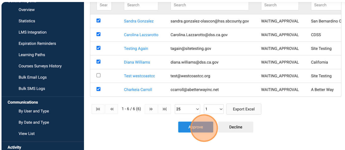 A confirmation message will appear at the top of the window. Indicating that the selected users have been approved. Click "Ok".
